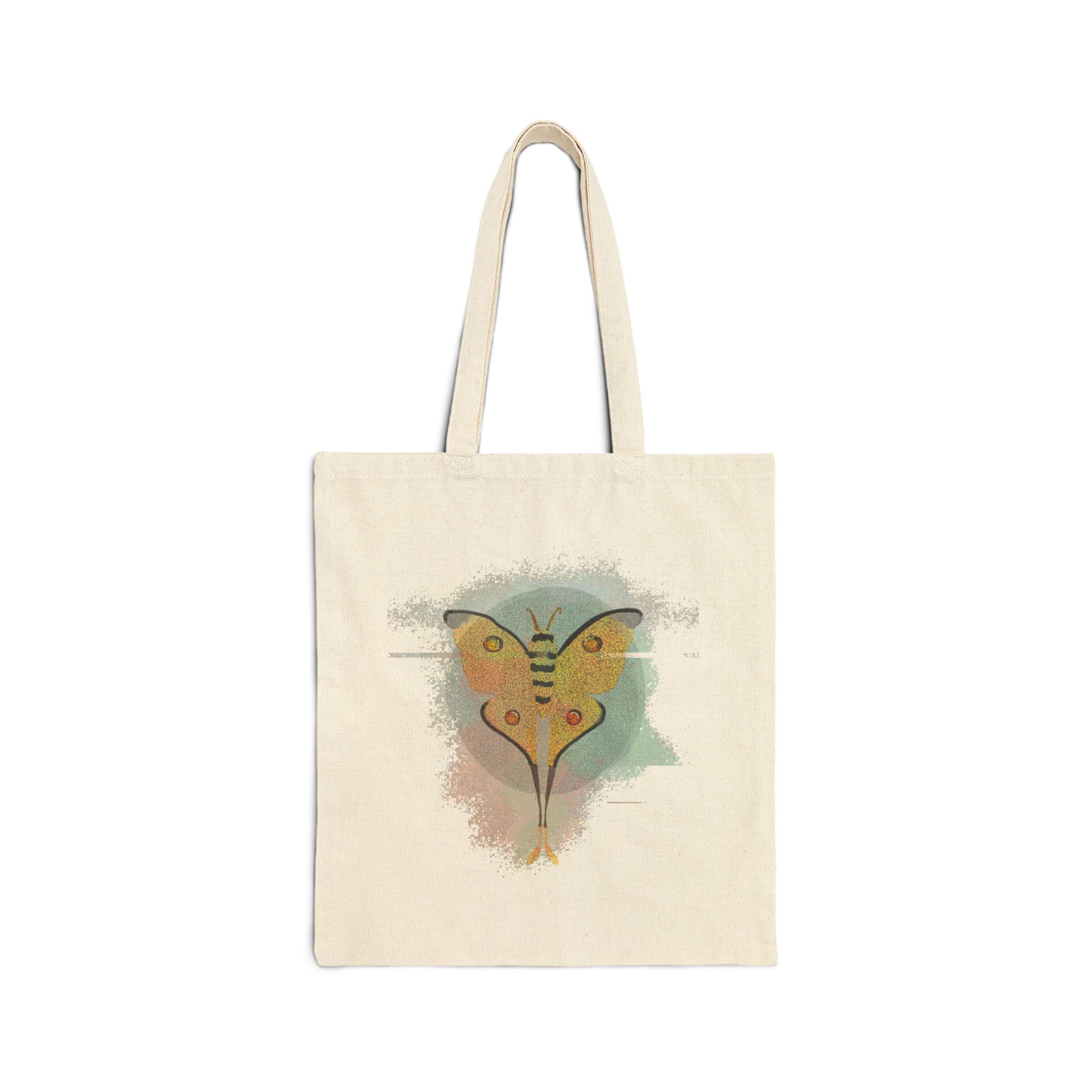 This cotton canvas tote bag features a beautiful design of a comet moth, giving off a nature-inspired and whimsical vibe. Perfect for eco-conscious individuals who want to carry their belongings in style. Ideal for nature lovers, gardeners, and those who appreciate unique and artistic designs. Great for gifting on birthdays, Mother's Day, or as a thoughtful eco-friendly gift.